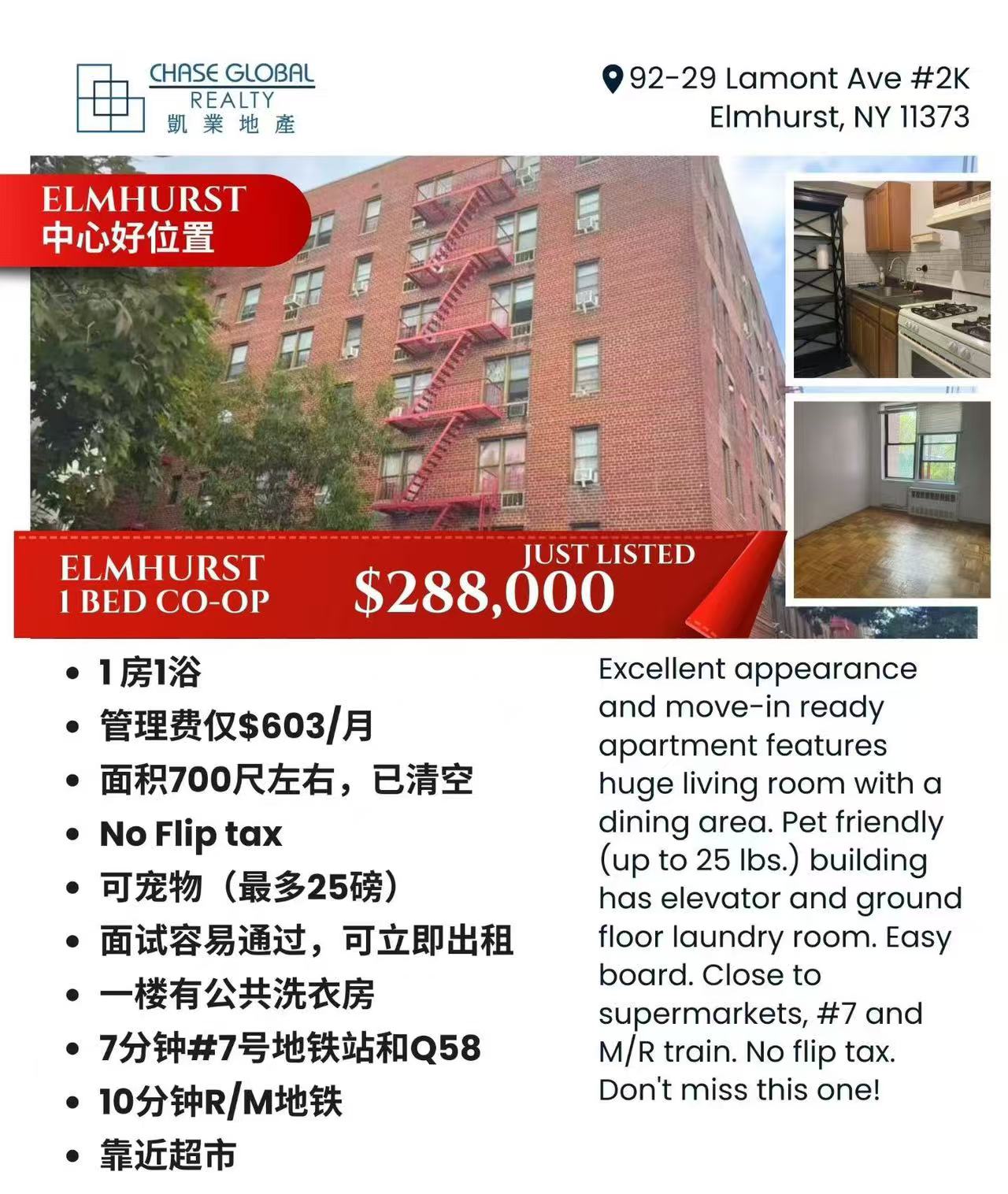 Elmhurst 中心1房coop (厅大容易2房)仅售$28万8,