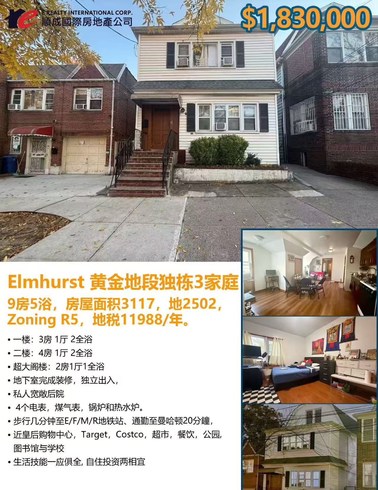 建于1930年,位于Elmhurst核心地段, 地面3层+地下室,房屋内部15年新, 屋况维护极佳