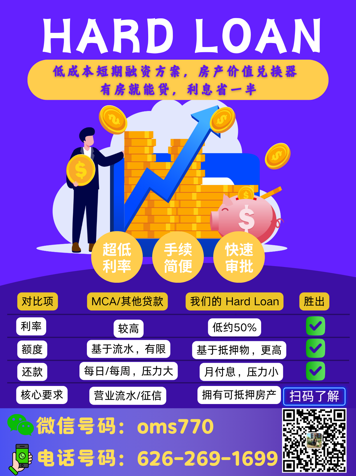 现在[color=rgb(0, 0, 0) !important]房产抵押 Hard Loan来了 —— 专为咱们华人设计的短期大额贷款: