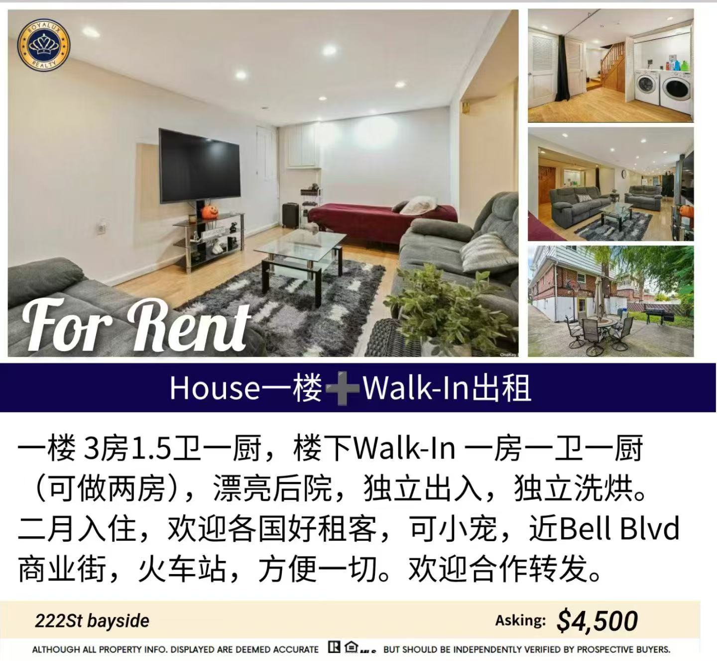 Bayside漂亮屋出租 租$4500/包水