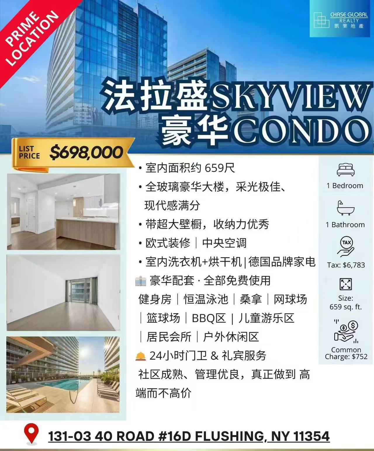 实用面积659尺+外加120尺大阳台,地税$6783/年, 管理费$752/月