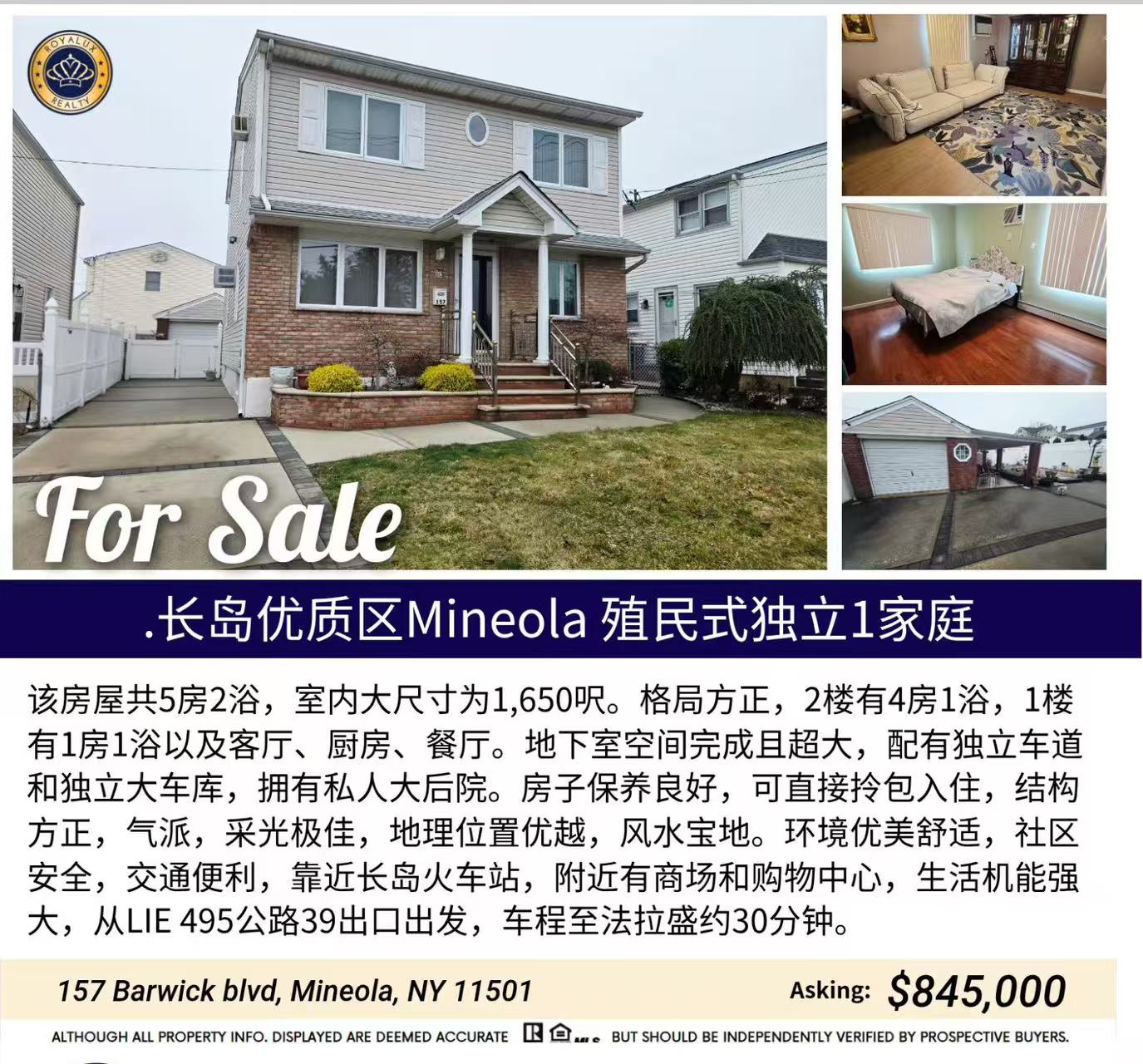 🏠长岛优质区Mineola 殖民式独立1家庭