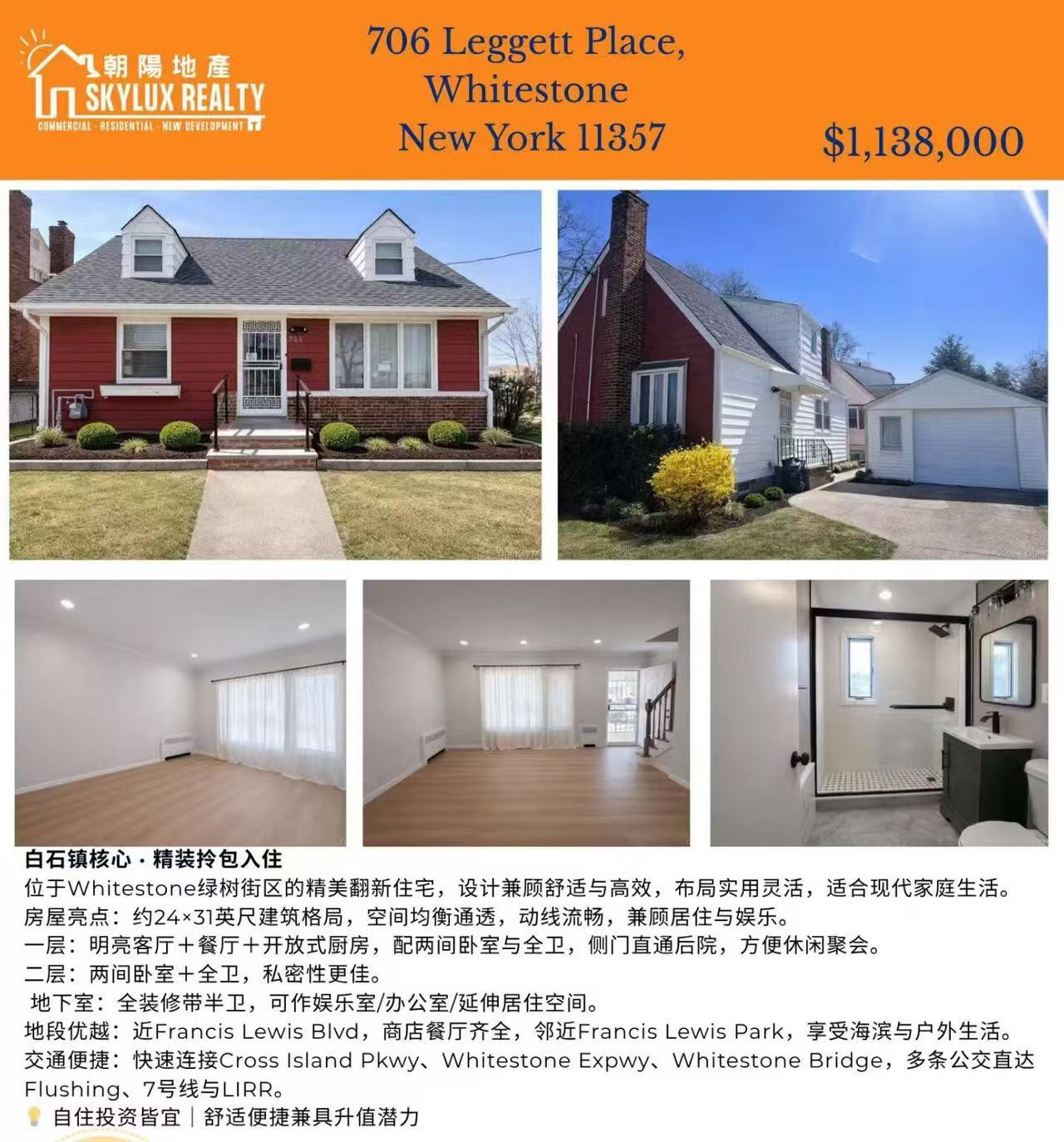 🚗 便捷交通:快速通达Cross Island Pkwy、Whitestone Expwy与Whitestone Bridge,多条公交线路(Q15、Q16、Q20、Q44)直达Flushing、7号地铁与LIRR。