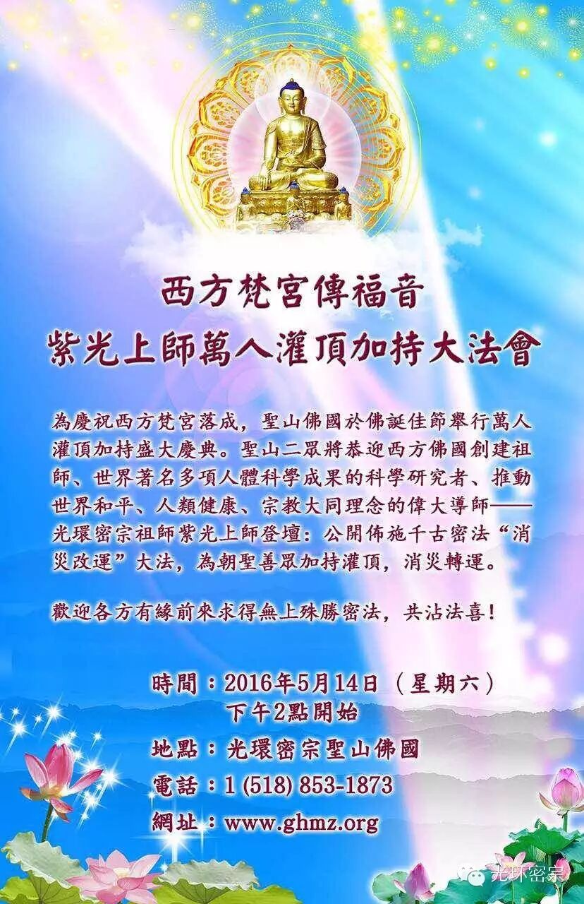 世界文化艺术交流中心将恭迎西方佛国创建祖师、世界著名多项人体科学研究者、推动世界和平、人类健康、宗教大同理念的伟大导师 ---- 紫光上师登坛:公开布施千古密法“消灾改运”大法,为朝聖善众加持灌顶,消灾转运。届时来自全球世界各地的信众有缘,将汇集圣山佛国,共同享受东西文化交流盛宴。