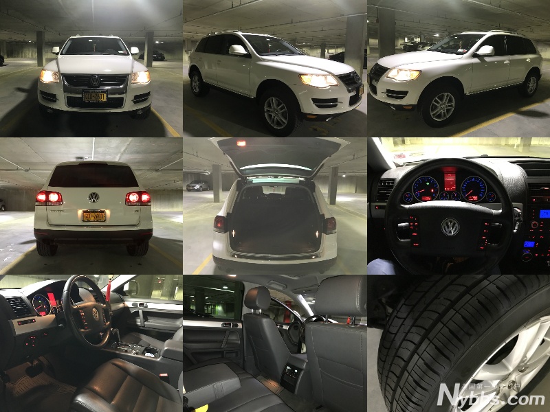 2008年VolkswagenTouareg V6, 3.6排量, 全时四驱外白内灰色,行驶79000miles,无事故无刮痕clean title,新换雨刷机油,轮胎和刹车状况优秀。配置包括自动座椅,座椅加热,天窗皮座,倒车雷达,自动车灯,自动雨刷,高级音响等。回顾急售价$9,999,机会难得.汽车位于 纽约长岛。 本人学生,购车于dealer,第二任车主。从来不跑长途,仅跑学校和超市。特别爱车,平时汽车停于地下停车场,每5000miles保养一次,1-2周deluxe wash一次。冬天即将来临,本车的舒适驾车体验,加之动力十足的四轮驱动,让您免于陷入雪里或者车轮打滑的困境。欢迎有兴趣的同学垂询,霸气途锐您值得拥有!