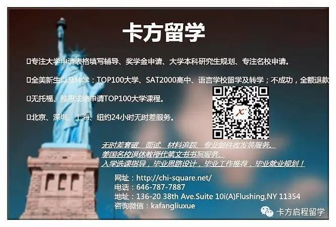 纽约,多家卡方办事处驻于中国北京、上海、深圳、辽宁、吉林等地,卡方服务纵贯中国南北。公司致力于为留学生提供最专业的名校录取服务,包括初中,高中,本科,研究生等。