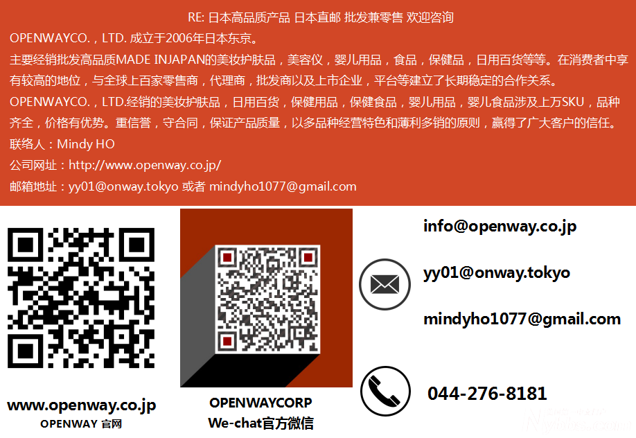 OPENWAYCO.,LTD. 成立于2006年日本东京。主要经销批发高品质MADE INJAPAN的美妆护肤品,美容仪,婴儿用品,食品,保健品,日用百货等等。在消费者中享有较高的地位,与全球上百家零售商,代理商,批发商以及上市企业,平台等建立了长期稳定的合作关系。