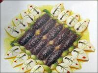 主料:水发辽参750克   配料:虾仁50克、鸡脯肉50克、净鱼肉50克、生肥膘50克、蛋清3个、菜胆20克、黄瓜5克、红椒5克、紫   菜5克   调料:鸡油50克、盐10克、味精5克、葱5克、姜5克、料酒5克、湿淀粉50克、胡椒粉5克、鸡汤20