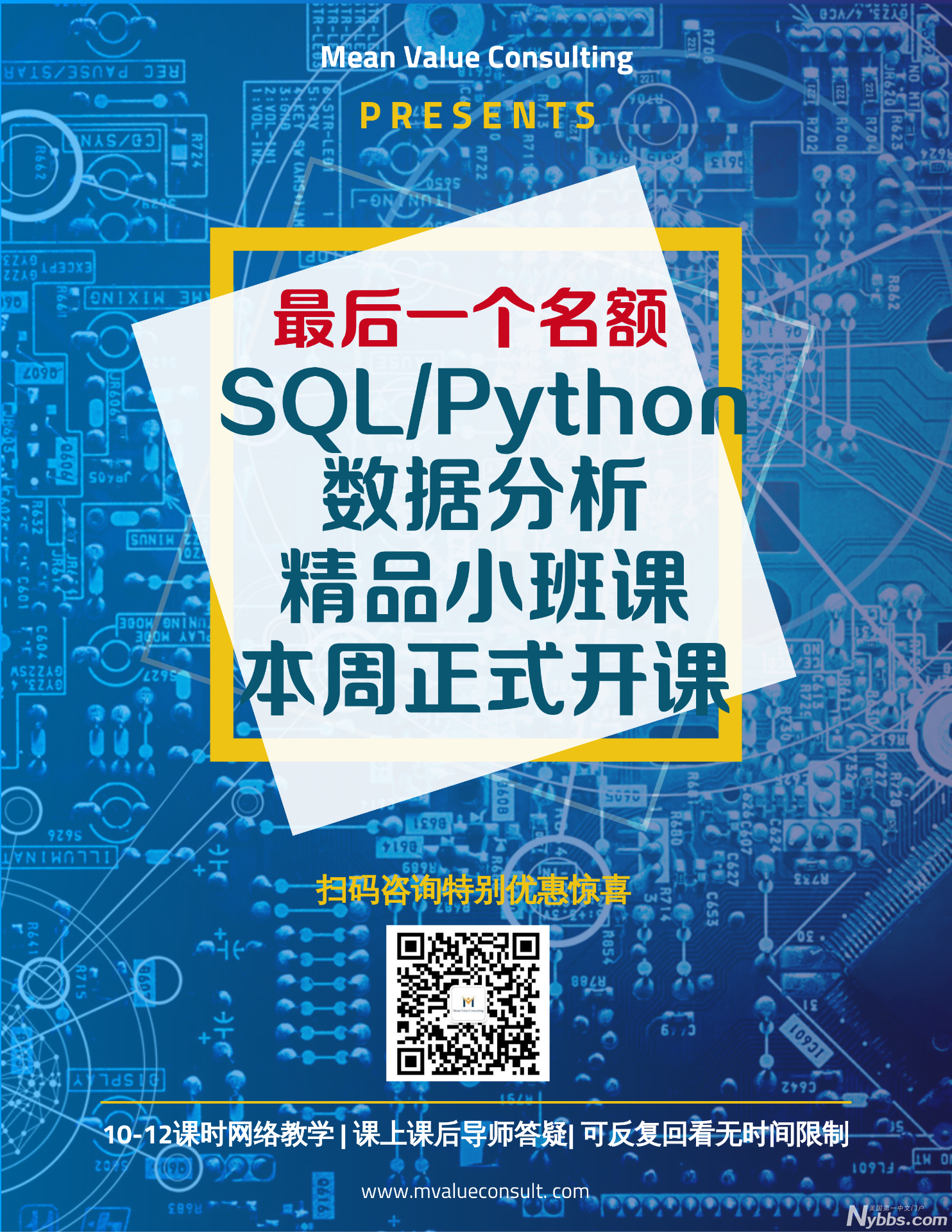你是否想要一个高薪H1B的职位?Data Scientist可以帮你做到!但是数据行业求职,需要扎实的数据技能,无论你对于数据科学是零基础,还是有数据、统计、计算机以及信息管理相关背景的,亦或是缺乏data方面实操训练的 MeanValue暑期SQL/Python精品课程,10-12课时精编Data Science实战网络直播课程为大家在学习数据语言的路上铺平道路。 · 提供小班live教学,保证学习质量 · Projects实操训练,课后作业和答疑巩固技能 · 为想找工作的同学丰富简历,提高求职竞争力 导师为Fortun30企业高级金融分析师/统计学专业在职大学教授,精通多种数据分析语言,拥有丰富的教学经验。 报名方式:添加Wechat:meanvalue-11,或扫描下方二维码,回复【数据课】咨询报名,现在报名还可享受超值优惠