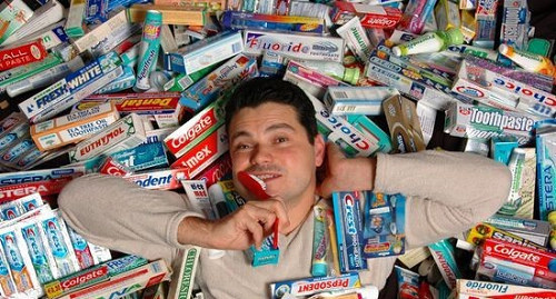 密歇根州的牙医Val Kolpakov以世界上最庞大的牙膏收藏引以为傲。这位在萨吉诺工作的牙医已经打破了最多牙膏的世界纪录,从2002年3月开始,他一共收集了1800支之多。但这些不都是薄荷味的,Kolpakov从世界范围内找到了威士忌酒味、咖喱、竹子味道的牙膏。