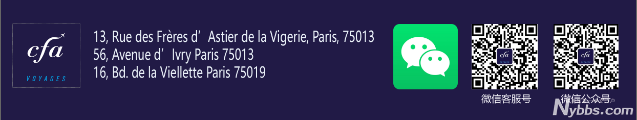 法国环亚旅游 CFA Voyages 【定制旅游】【巴黎地接】法国巴黎华人旅行社-环亚旅游 环亚旅行社 (CFA Voyages)--- 法国巴黎最大的正规华人旅行社 法国环亚旅行社是一家老牌的法国华人旅行社。它始创于1986年,地处法国巴黎华人街中心地段,在巴黎有3个门市部,距今已进入了它第34年的经营,是成立最早的综合性法国华人旅行社之一。 欧洲巴士游 在环亚旅游您几乎能找到欧洲市场上所有的巴士团线路,欧洲大巴游,巴黎市区及周边一日游,周末游等六十多条线路。 1. 法国短途旅游团(巴黎出发) 巴黎周边-圣米歇尔山1日游:一般周三,周日出发 69欧起/人 -卢瓦尔城堡1日游:一般周二出发 69欧起/人 荷兰郁金香赏花3日游: 郁金香/羊角村/鹿特丹/阿姆斯特丹 特色烤乳猪宴 – 4月11日/4月18日/5月1日168欧起/人 2. 欧洲多日游(巴黎出发) 欧洲经典5日游 – 一般周六出发 390欧起/人 寻找英伦7日游 – 一般周二,周六出发 546欧起/人 法意瑞8日游 - 一般周五出发 548欧起/人 东欧7国9日游 - 一般周六出发 568欧起/人 西班牙葡萄牙9日游 – 一般周六出发 628欧起/人 3. 欧洲豪华邮轮之旅 我社销售多种多样的邮轮线路,我社为歌诗达邮轮巴黎大区最佳销售旅行社,MSC地中海邮轮,皇家加勒比邮轮,公主邮轮,欧洲内河邮轮的15000多条邮轮路线。除了经典的欧洲邮轮,我们还销售亚洲(日韩,东南亚,迪拜),北美洲(阿拉斯加,加勒比海)南美洲,澳洲以及纽西兰的邮轮线路。 (多条线路多个出发日期可选) 地中海经典线路 : 法国马赛上下船,途经西班牙巴塞罗那,帕尔马,意大利罗马,拉斯佩齐亚 Costa豪华游轮新船Smeralda – 299欧起/人 MSC邮轮 Virtuosa新船超级特价 – 意大利,马耳他,西班牙599欧起 /人 4. 欧洲定制游专家 承接各类家庭和亲子游策划 欧洲多国特色游,法国深度游,蜜月之旅 欧洲奖励旅游之旅以及高端VIP私人定制主题之旅 巴黎经典三日游 - 6人小团,370欧起 5. 自助游商城 接送机服务:戴高乐机场/ 奥利机场 包车20-55座大巴/ 5-9座商务车+中文导游服务 塞纳河游船/游船餐,铁塔午/晚餐,红磨坊表演秀,丽都夜总会 支持多种支付方式 银行转账 信用卡支付 网上支付 支付宝 微信 联系我们 服务专线: +33 (0)1 70 37 75 95 微信客服:cfavoyages1986 微信公众号:CfaVoyages 扫码关注我们的 微信了解更多特价旅游咨询噢~