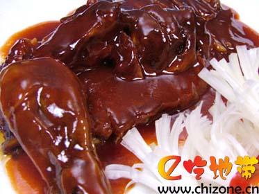 颜色油红光亮,酱香四溢,鲜嫩适口,咸中略甜。