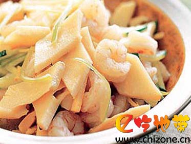 2.香油烧5成热时,炸姜末,烹料酒,放入海米、珍珠笋、高汤、精盐,颠炒装盘即成。