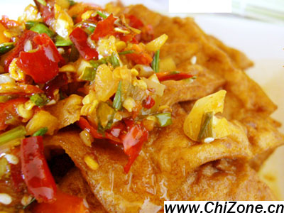 1.将猪肉整块抹上调料,覆上微波薄膜,转四分钟,取出待凉,切薄片,豆腐干切斜薄片,青、红辣椒切小块;