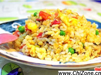 白饭2小碗,鸡蛋1个,洋火腿、豌豆仁、胡萝卜、玉米粒各少许,葱末1大匙,盐1茶匙半,味精半茶匙,胡椒1小匙。