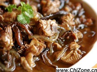 小鸡炖蘑菇,名副其实的山珍野味。是东北菜的代名词之一,也是东北菜中少数可以发展成为与其他高档菜系相媲美的家常菜之一。此菜式传入关内后,又有厨师加以改进,在其中加上绿豆粉皮一块儿煮,也是别有风味。尤其是在冬天吃,还有活血祛寒、预防风寒侵袭的作用。