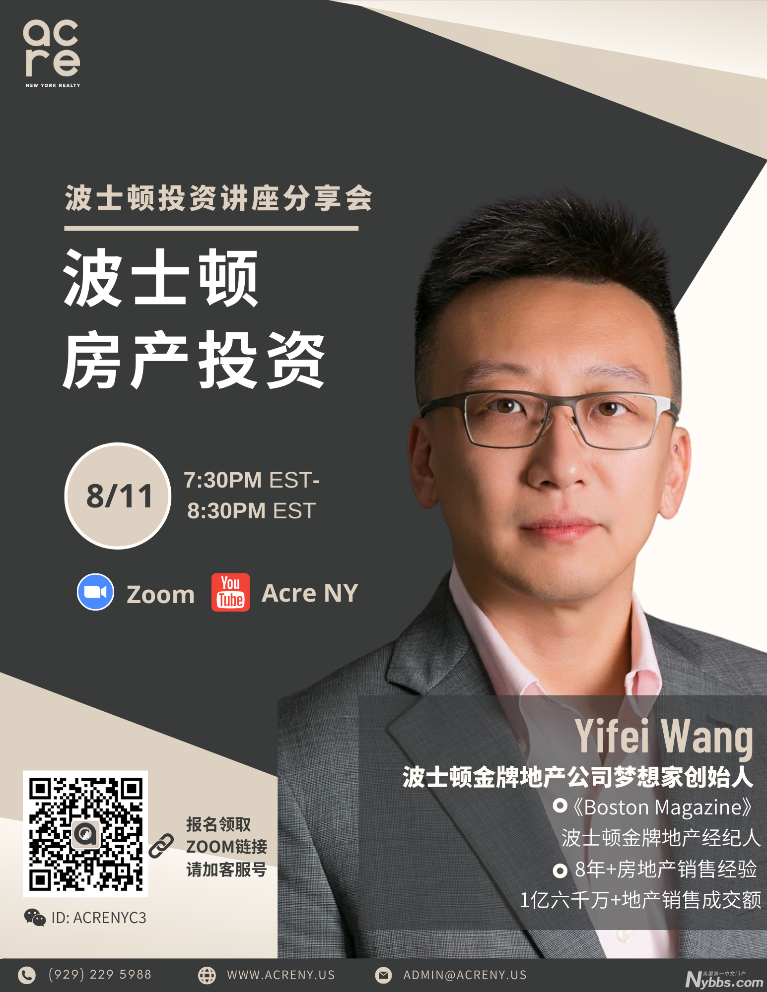 好消息来了,就在本周四!Acre的八月线上地产专家讲座第二期邀请到的重磅嘉宾是波士顿地产公司梦想家创始人,拥有8年+地产销售经验的波士顿金牌Managing Broker Yifei Wang,带你聚焦波士顿投资回报率最高的三大区域,让你轻轻松松所房东。