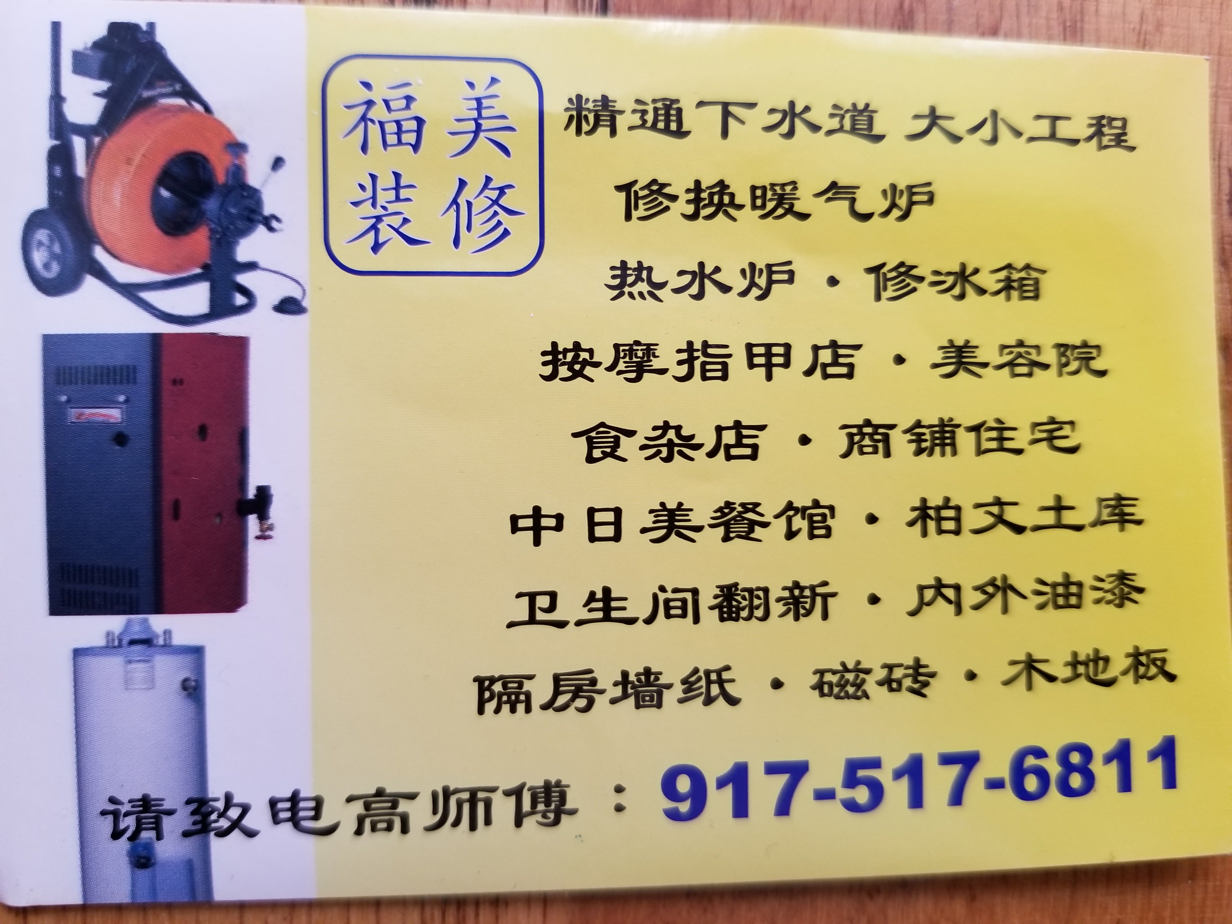 ###福美装修水喉###包通下水管道,安装维修暖气炉/热水炉 40加仑10年保养$850/50加仑10年保养$950 修冰箱,修换车库电动门